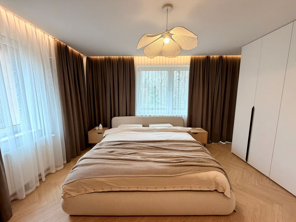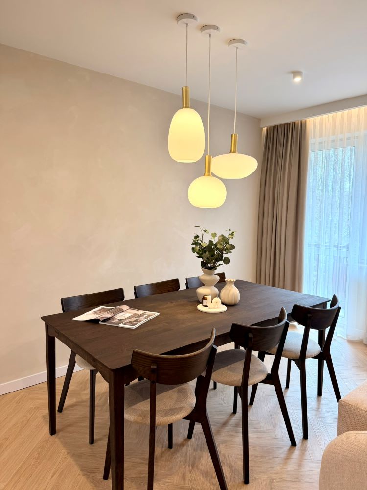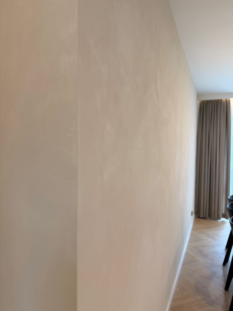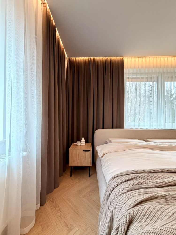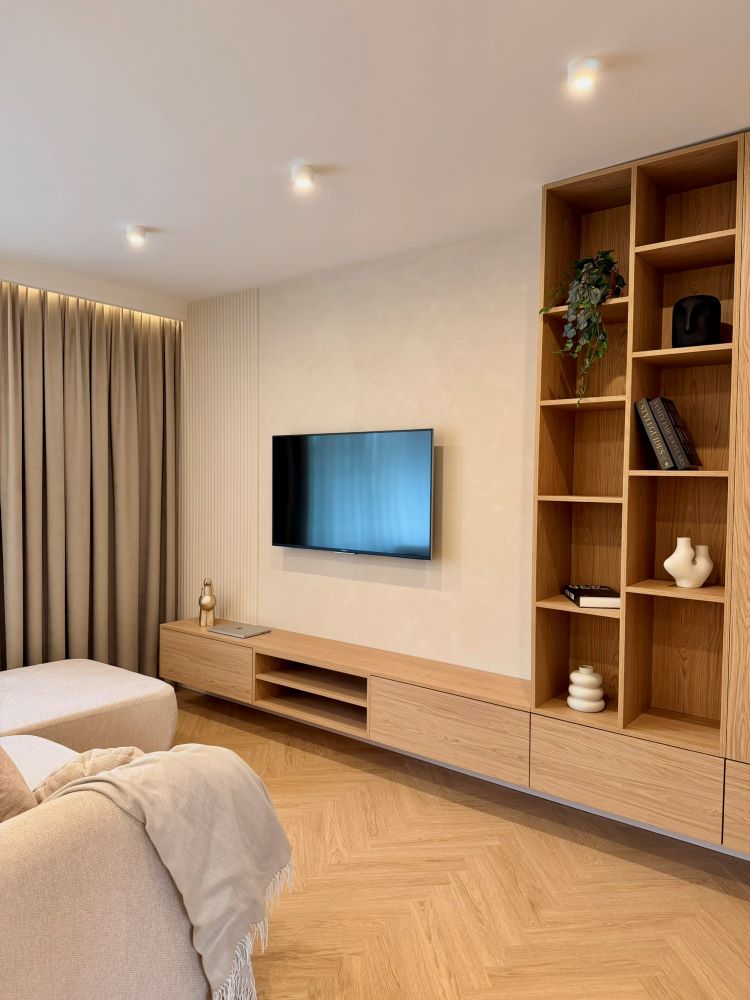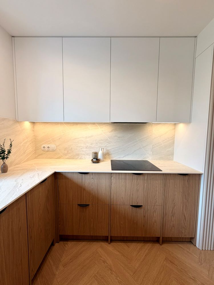 Ta realizacja została utrzymana w minimalistycznej i nowoczesnej stylistyce, w której dominują beże i mnóstwo struktur. Ciepły i przytulny charakter wnętrza oraz mnóstwo zorganizowanego miejsca do przechowywania. Całość uzupełniają ukryte drzwi pokryte tynkiem dekoracyjnym, proste detale i subtelne oświetlenie.