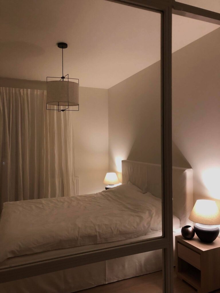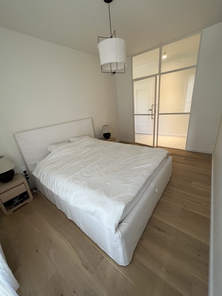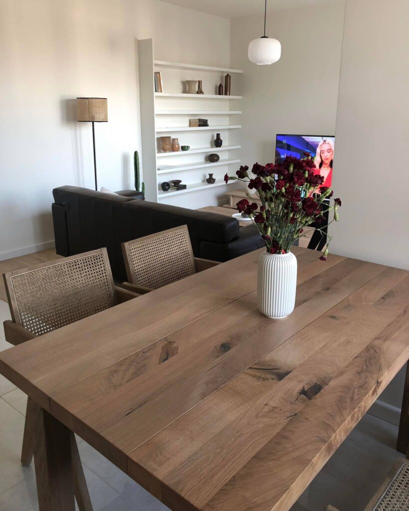 To mieszkanie wykańczaliśmy dla klientów, którym szczególnie zależało na naturalnym drewnie na podłodze w strefie dziennej, różnych strukturach oraz jasnych ścianach, które sprawiły, że światło odbijało się jeszcze lepiej i optycznie powiększyły całą przestrzeń. W łazience klienci zdecydowali się na minimalistyczne wykończenie z jasnymi płytkami, czarną armaturą i dużym lustrem. Całość uzupełniły dodatki oraz oświetlenie inspirowane stylistyką Westwing.