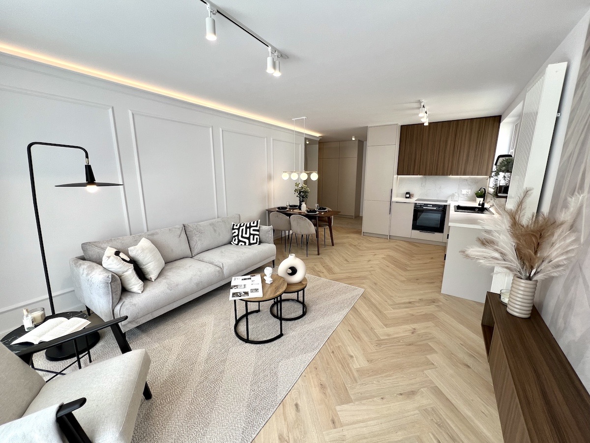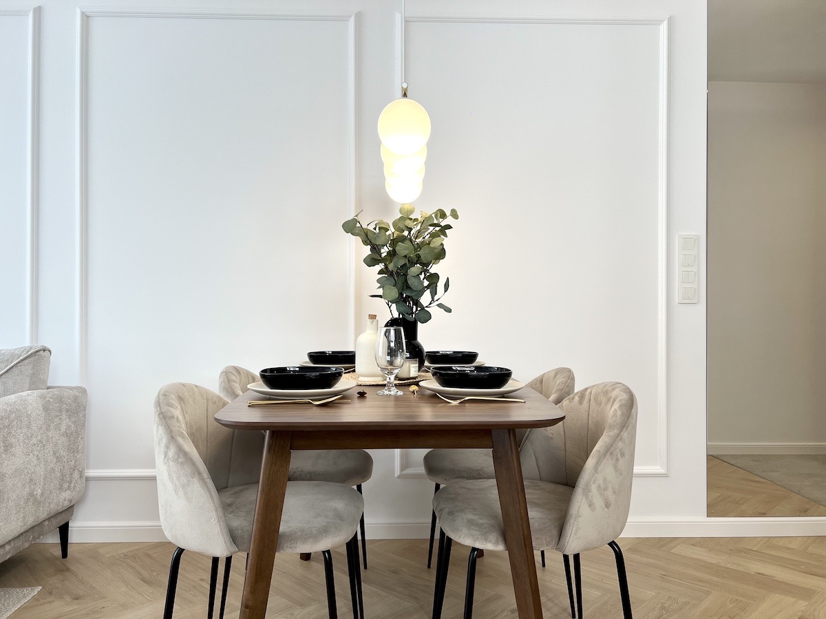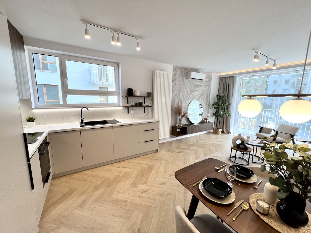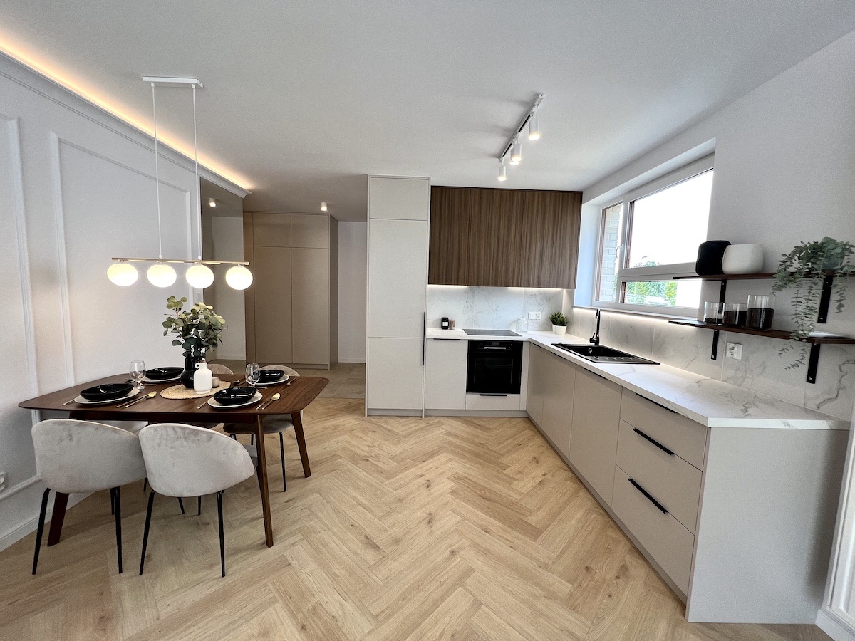 W przypadku tego mieszkania Nasi klienci zdecydowali się na połączenie mebli w odcieniu kaszmir oraz ciemny orzech. Stonowane jasne fronty doskonale współgrają z ciepłym drewnem, tworząc spójną i bardzo przytulną przestrzeń. W łazience zdecydowali się jednak na nieco bardziej wyrazisty i mocniejszy wzór płytek, który przełamuje spokojną, elegancką bazę.