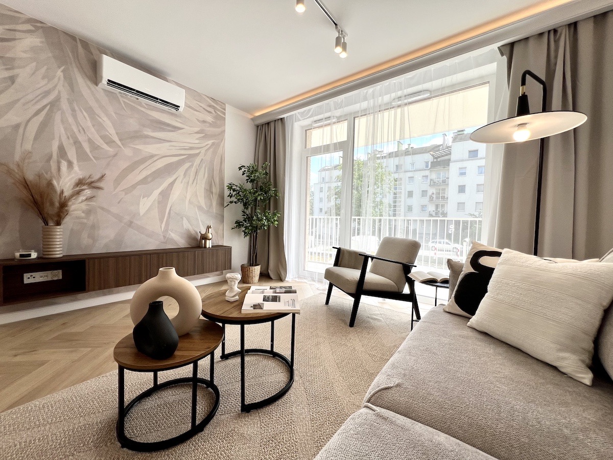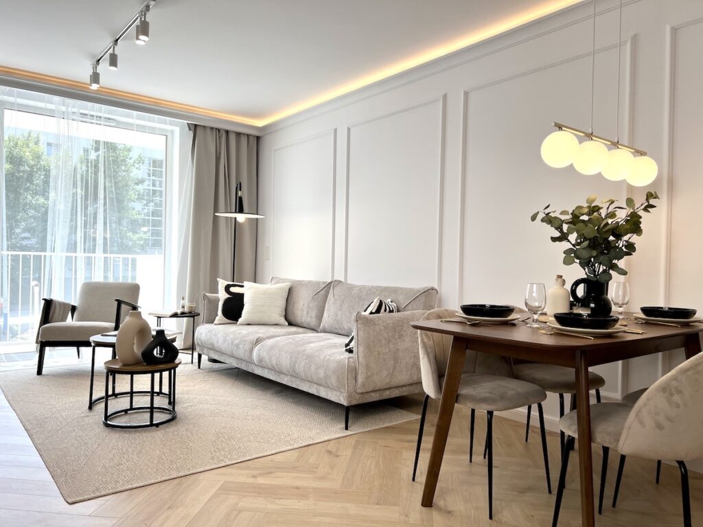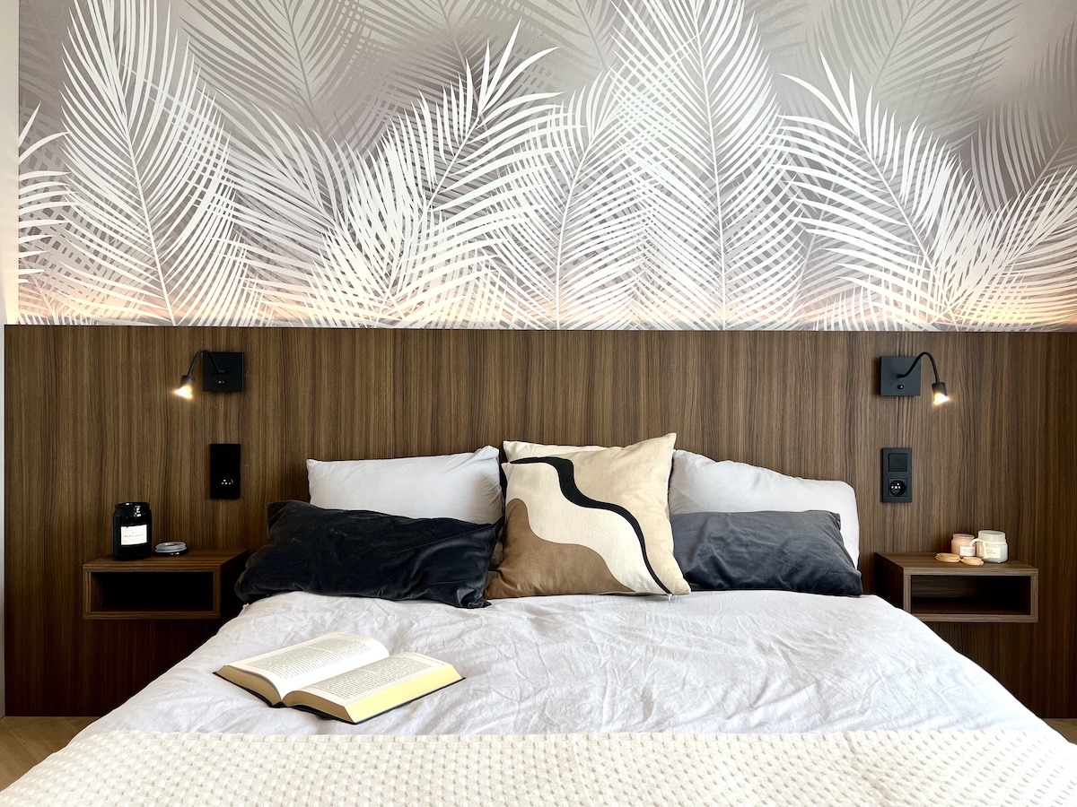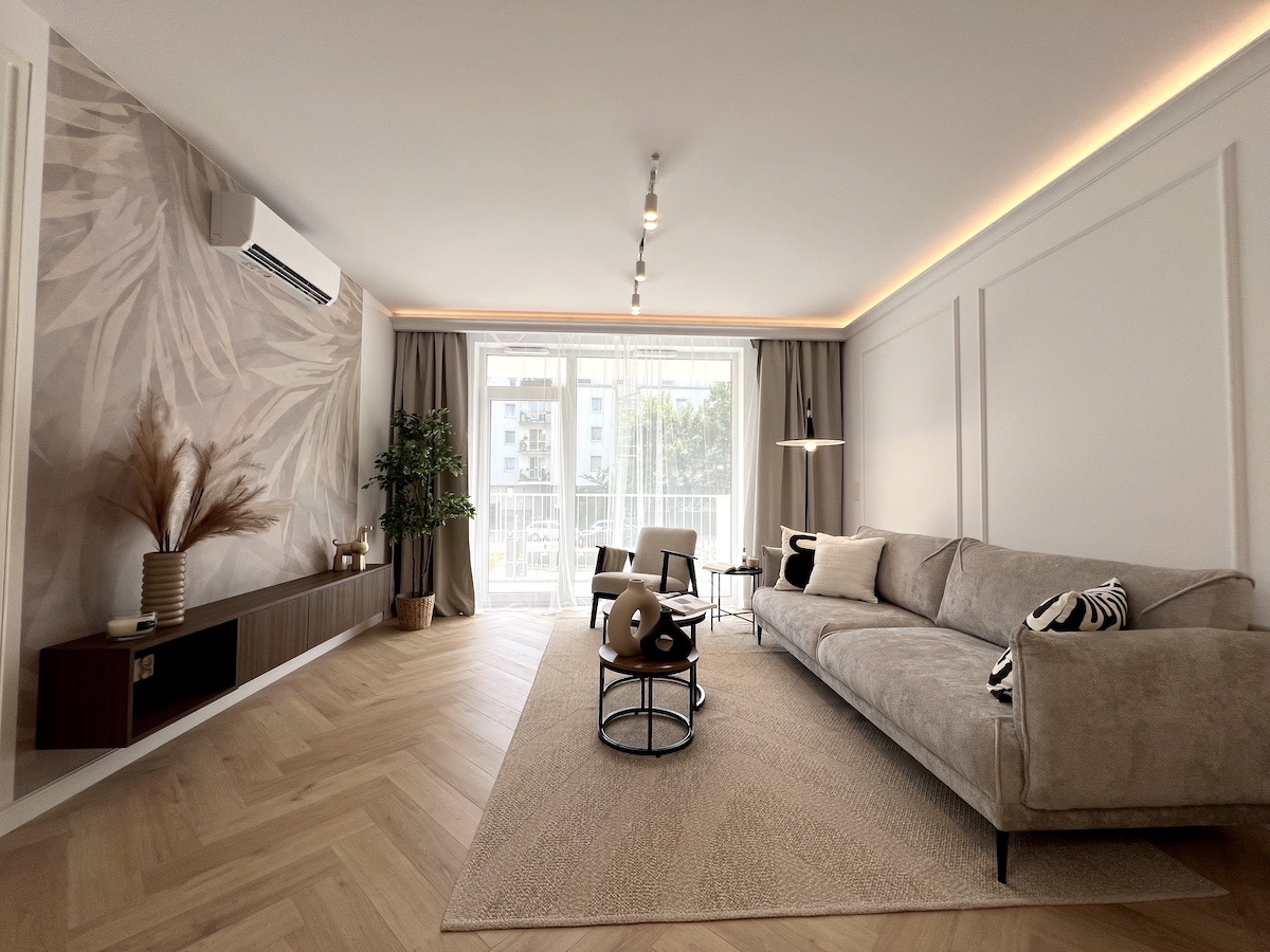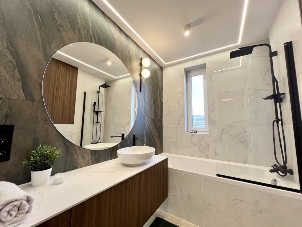 W przypadku tego mieszkania Nasi klienci zdecydowali się na połączenie mebli w odcieniu kaszmir oraz ciemny orzech. Stonowane jasne fronty doskonale współgrają z ciepłym drewnem, tworząc spójną i bardzo przytulną przestrzeń. W łazience zdecydowali się jednak na nieco bardziej wyrazisty i mocniejszy wzór płytek, który przełamuje spokojną, elegancką bazę.
