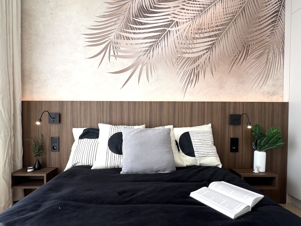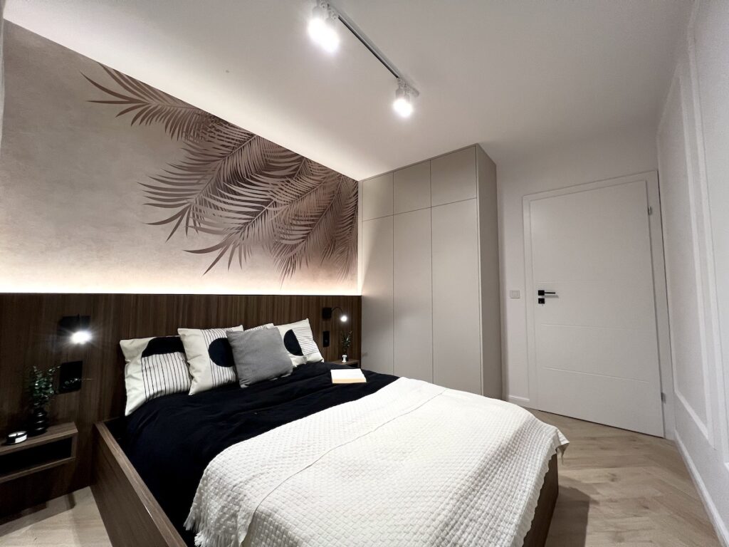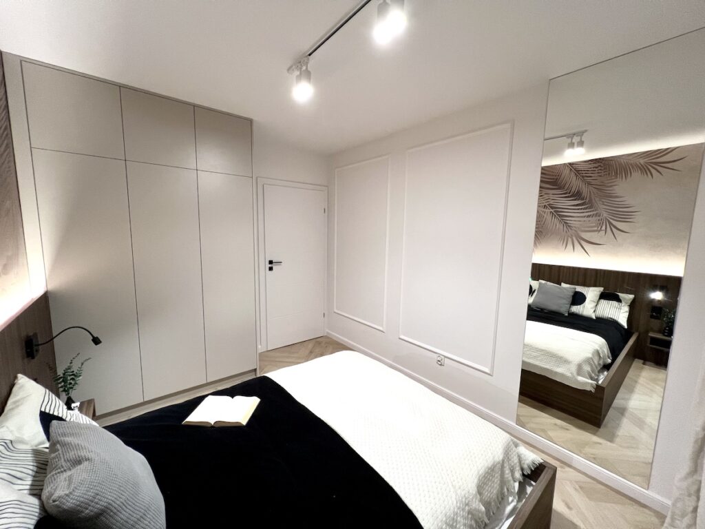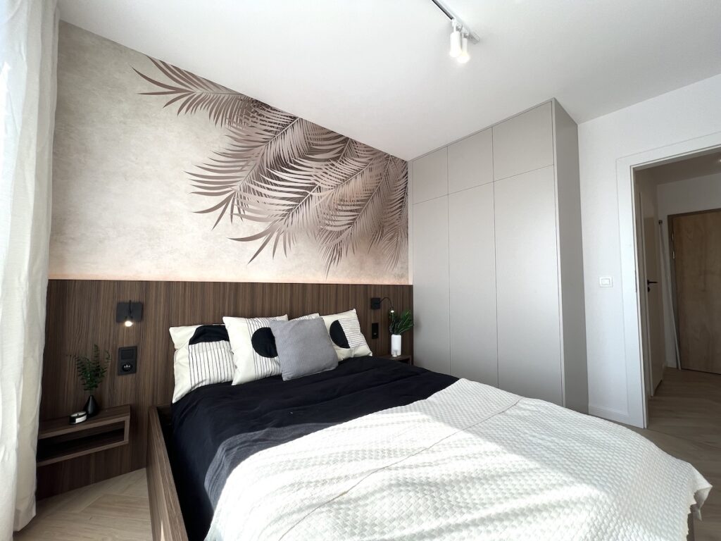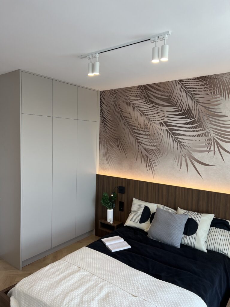 To mieszkanie o powierzchni 36m2 zrealizowaliśmy kompleksowo pod klucz, maksymalnie wykorzystując powierzchnię. Razem z klientami zdecydowaliśmy się na zabudowy meblowe w kolorze ciemny orzech i kaszmir. Ścianę w strefie dziennej wykończyliśmy tapetą z motywem liści, która dominuje również w sypialni. Zastosowaliśmy również gzyms sufitowy z oświetleniem LED.