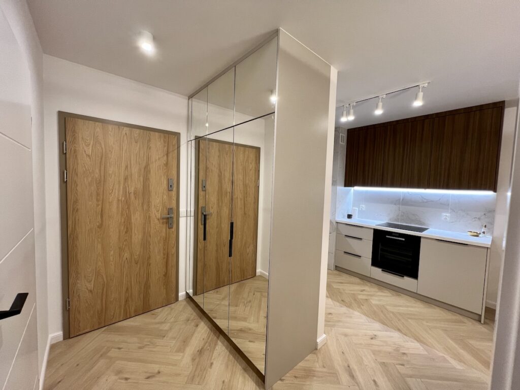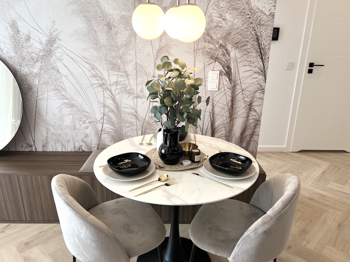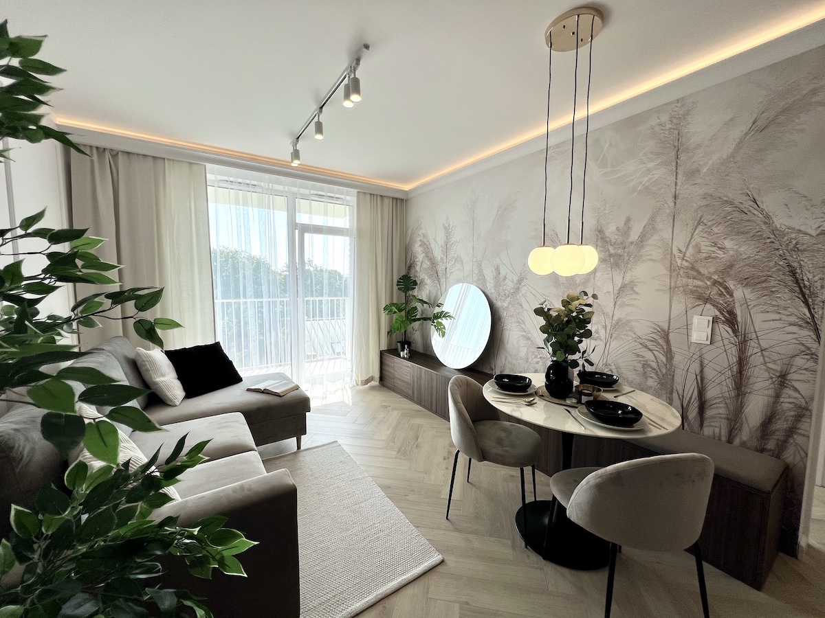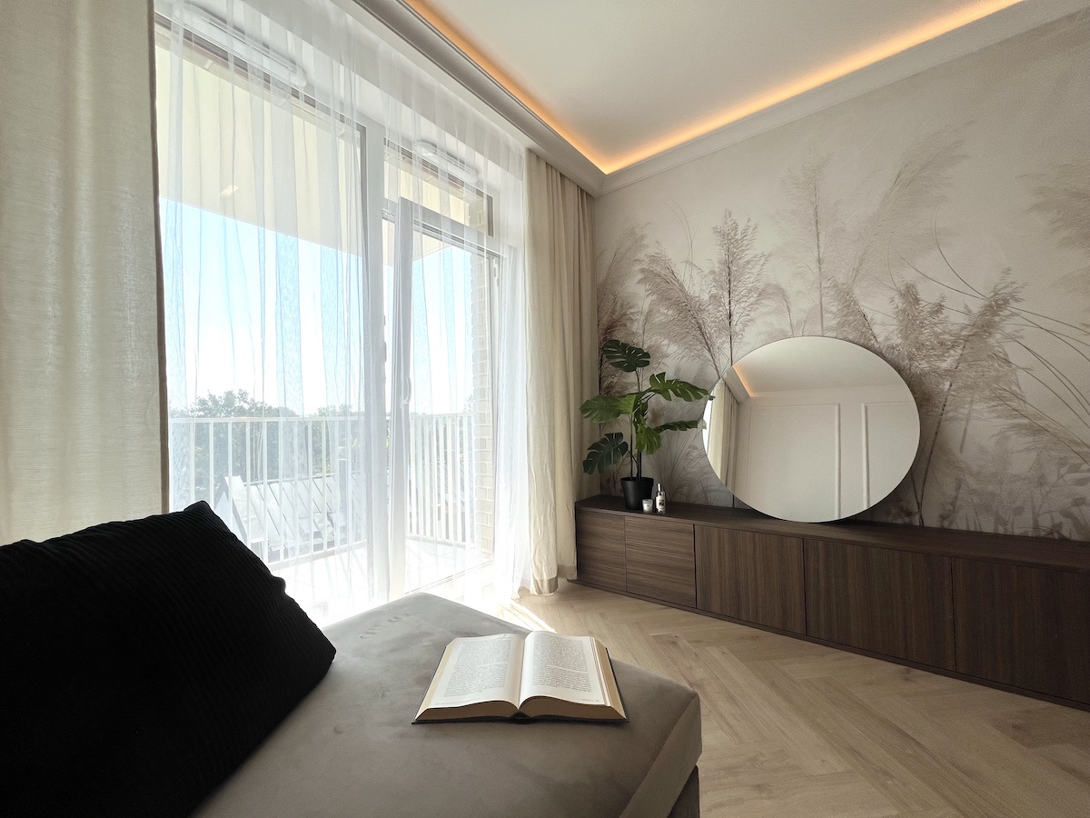 To mieszkanie o powierzchni 36m2 zrealizowaliśmy kompleksowo pod klucz, maksymalnie wykorzystując powierzchnię. Razem z klientami zdecydowaliśmy się na zabudowy meblowe w kolorze ciemny orzech i kaszmir. Ścianę w strefie dziennej wykończyliśmy tapetą z motywem liści, która dominuje również w sypialni. Zastosowaliśmy również gzyms sufitowy z oświetleniem LED.