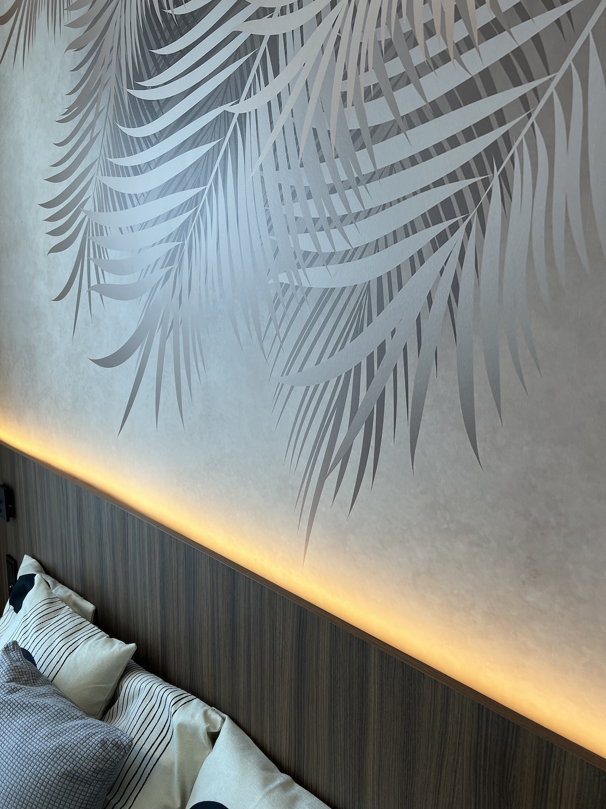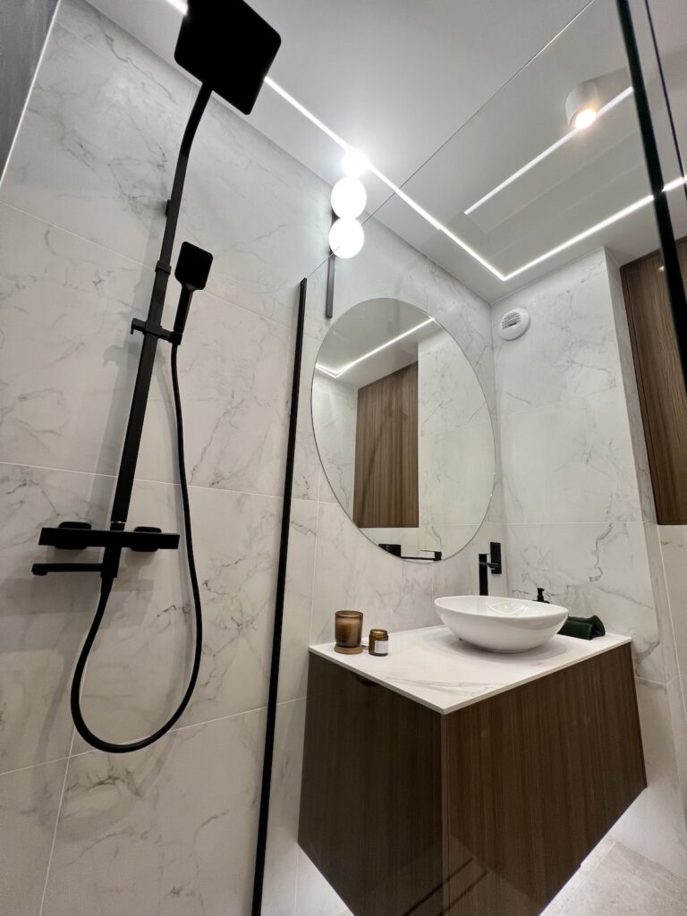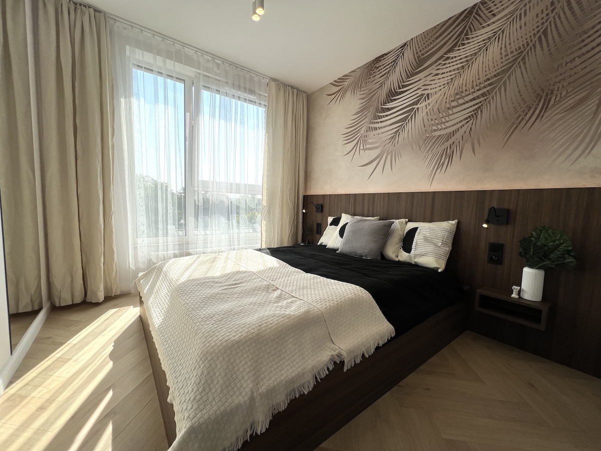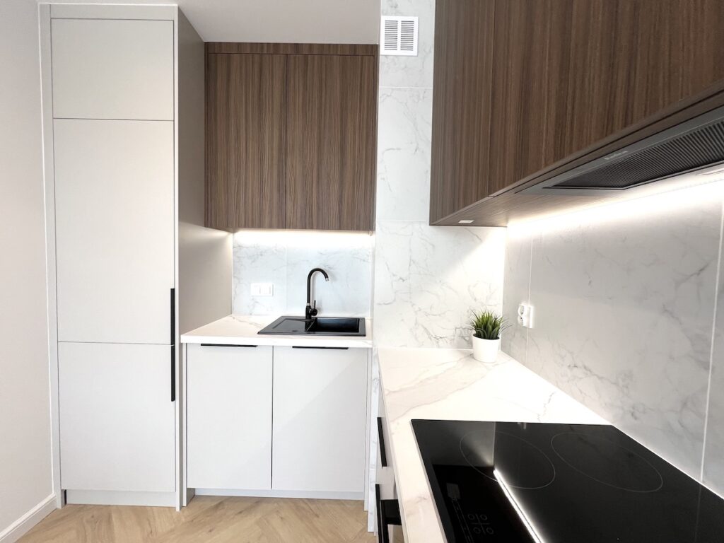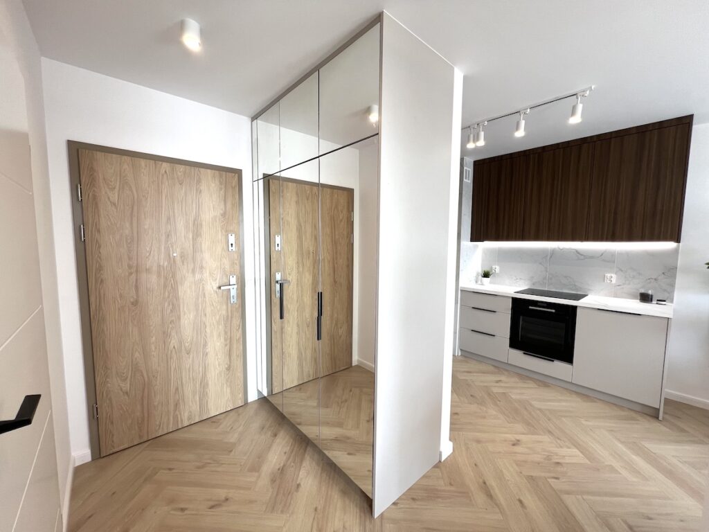 To mieszkanie o powierzchni 36m2 zrealizowaliśmy kompleksowo pod klucz, maksymalnie wykorzystując powierzchnię. Razem z klientami zdecydowaliśmy się na zabudowy meblowe w kolorze ciemny orzech i kaszmir. Ścianę w strefie dziennej wykończyliśmy tapetą z motywem liści, która dominuje również w sypialni. Zastosowaliśmy również gzyms sufitowy z oświetleniem LED.