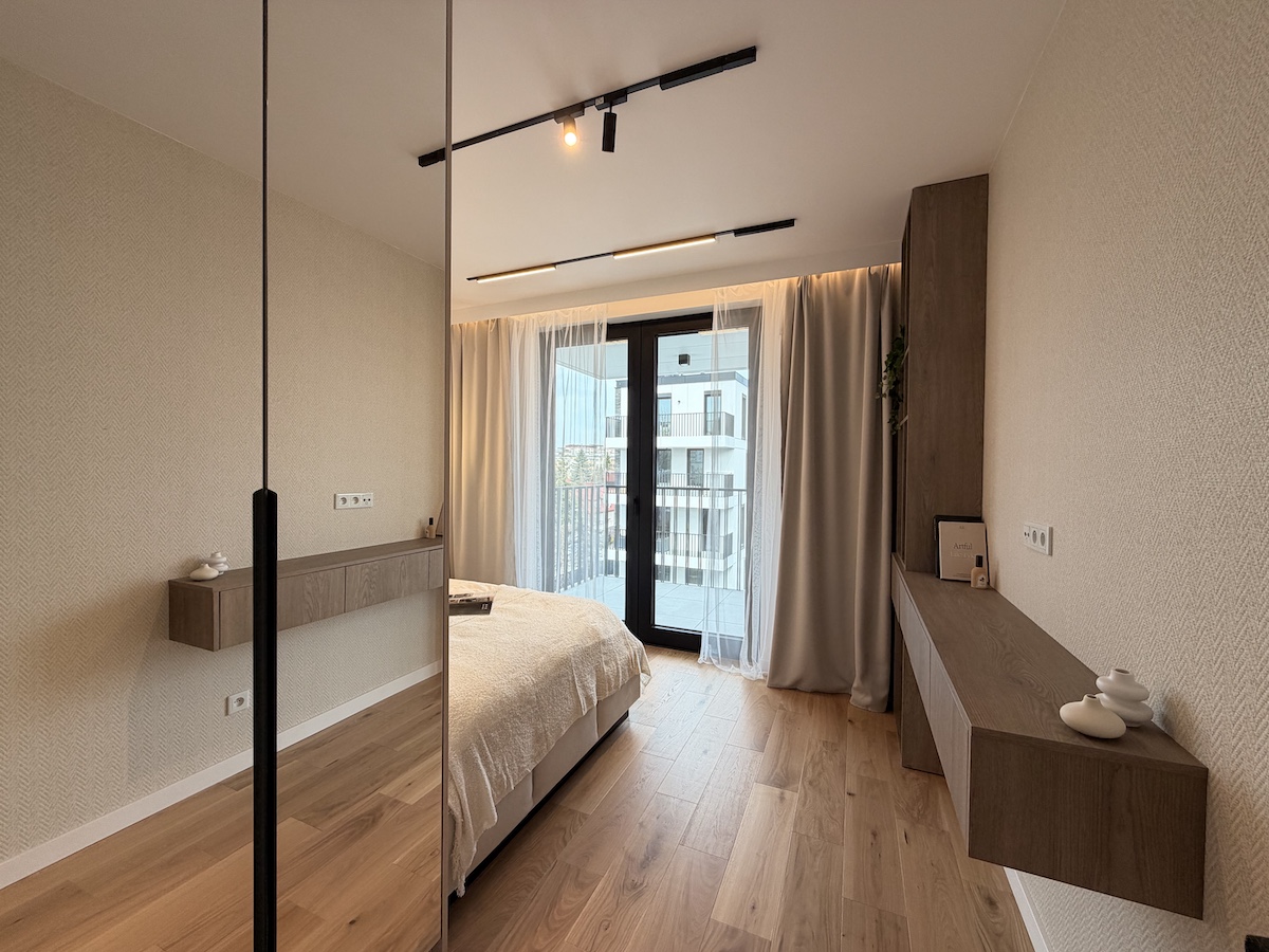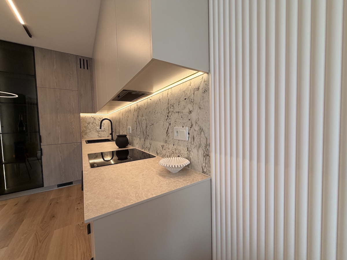 To propozycja dla osób, które cenią nowoczesne wnętrza z wyraźnym charakterem. Linia opiera się na zestawieniu frontów w kolorze kaszmir, ciemny dąb oraz antracyt, które tworzą elegancką i kontrastową bazę. Jasne, neutralne powierzchnie zestawione są z wielkoformatowymi płytami węglowymi i płytkami o mocno dominującym, marmurowym wzorze. Całość dopełnia wyraziste oświetlenie, czy zdecydowane struktury materiałów.