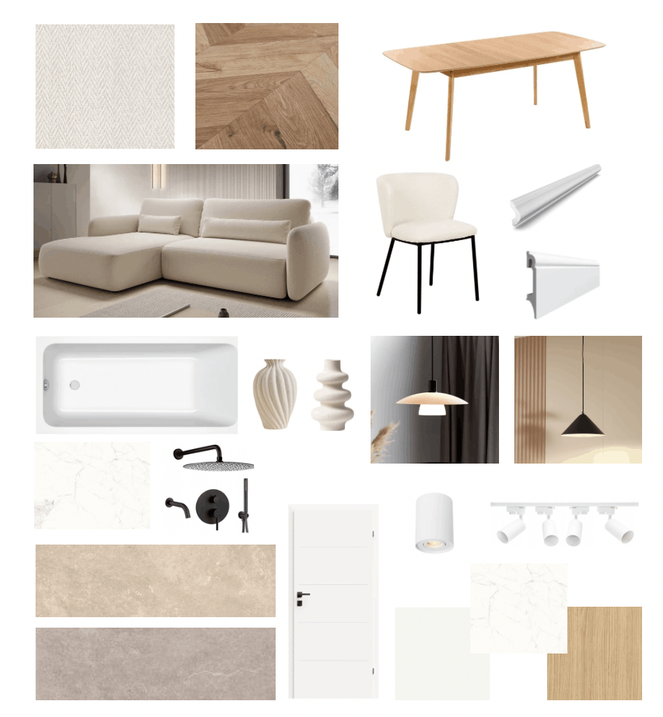 W tej linii wykorzystujemy naturalne materiały i jasne struktury, które podkreślają lekkość aranżacji. Jasny dąb, biel i subtelne faktury tapet, czy płytek tworzą spójną, ciepłą i bardzo jasną przestrzeń.
